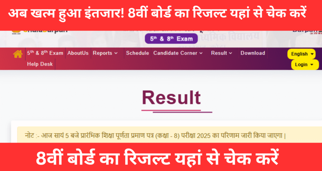 शिक्षा विभागीय परीक्षाएं, बीकानेर के अनुसार, RBSE 8th Result 2025 को 26 मई 2025 जारी किया जाएगा। सभी विद्यार्थी अपना रोल नंबर डालकर शाला दर्पण की वेबसाइट पर अपना परिणाम देख सकेंगे।